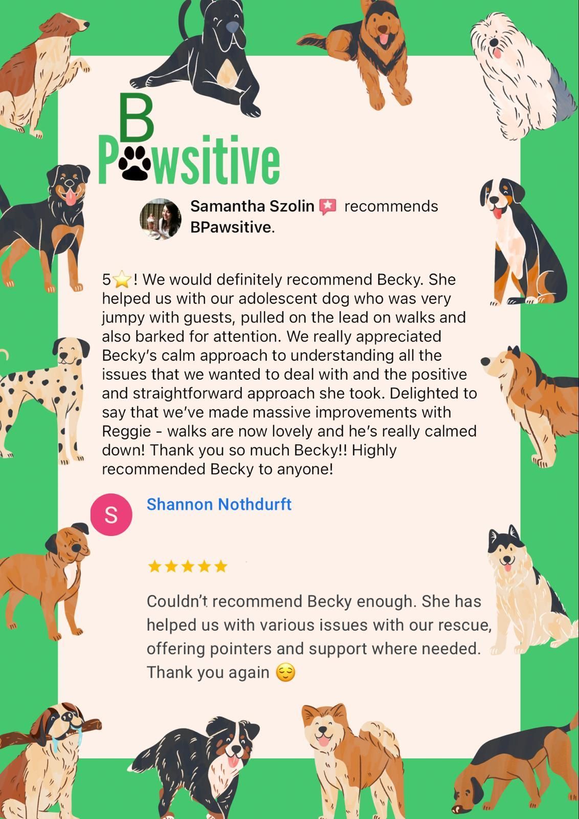Having gained valuable experience working with Dogs of all breeds, ages and sizes, BPawsitive are confident that we can give you the tools that you need to help enrich your dogs life, provide them with valuable life skills and by giving them the guidance and support that they need throughout their various life stages.